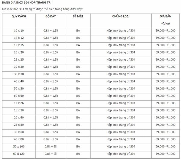 Việc hiểu rõ cấu tạo và thành phần của inox hộp 304 không chỉ giúp bạn lựa chọn sản phẩm phù hợp mà còn giúp bạn hiểu rõ hơn về bảng giá inox hộp 304. Giá cả thường biến động dựa trên chất lượng nguyên liệu, kích thước và hình dạng của sản phẩm. Do đó, để có được sự lựa chọn tốt nhất, bạn nên tìm hiểu kỹ về các yếu tố này trước khi quyết định mua hàng.